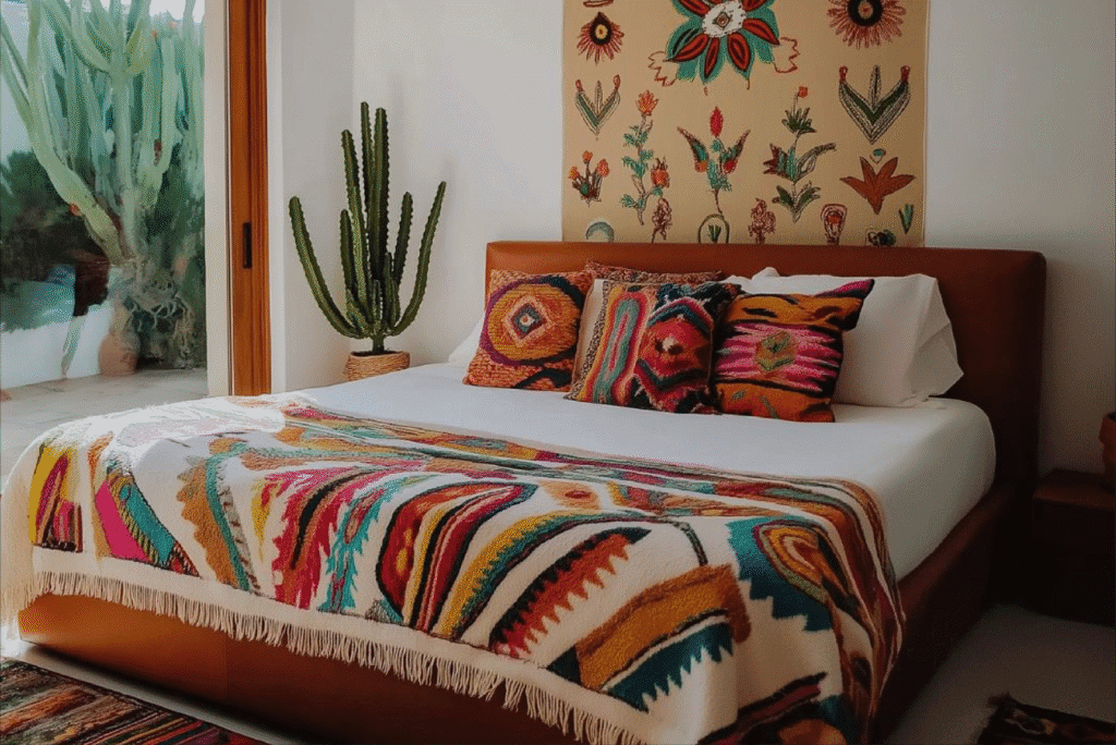 El rojo vibrante, el verde profundo, el azul y los tonos tierra evocan paisajes, fiestas y tradiciones de México. Usar estas paletas en muros, textiles o detalles crea ambientes acogedores y memorables.